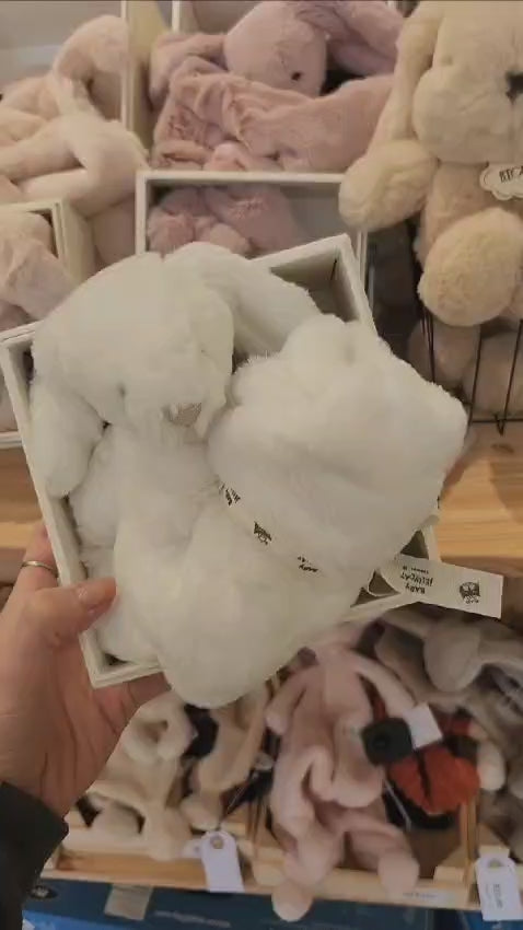 Bashful Luxe Bunny Luna Soother is irresistible to touch in our softest pure white fur. A lop-eared bunny with stitched eyes and gold thread nose holds our finest soother. Choose from a selection of fonts and thread colors to personalize the blanket and create an extra special gift.