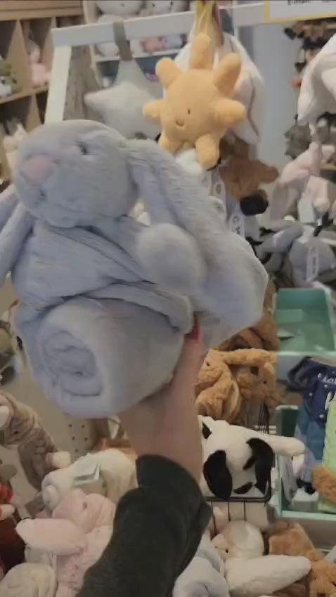 The Bashful Silver Bunny Blankie combines our most loved Bashful Bunny character’s long lop ears, pink suedette nose, embroidery eyes and soft squashy paws with a blankie made from the same cloud soft, silver-grey coloured fur in recycled fibres. Neatly rolled and tied with a Baby Jellycat grosgrain ribbon, this is an exquisite gift of endless comfort and timeless charm.