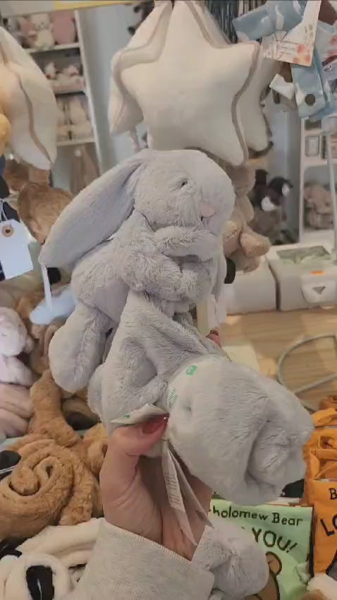 Scampering through the forest, you might just spot the Bashful Grey Bunny Soother. This scrummy-sweet bunny with flopsy ears looks after a soother just as soft as herself. Perfect for sleepyheads and tots on the hop - from buggy to cot, she's a bunny boon.