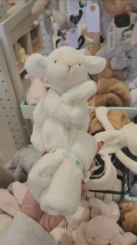 • Sweet, gentle Bashful Lamb Soother is a perfect newborn gift, rolled up and presented in a Baby Jellycat grosgrain ribbon. Featuring our most loved farmyard friend, soft in a vanilla cream fur made from recycled fibres and holding on tight to a smooth, un-stuffed square shaped soother; a simply gorgeous cuddle companion.