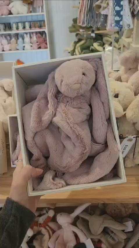 A luxurious newborn gift, the Bashful Luxe Bunny Rosa Blankie is exquisitely soft in a Rose hued fur. Featuring the head and paws of Rosa Bunny in the corner of a silky soft blanket. Rolled and wrapped with a grosgrain ribbon and elegantly presented in a satin sheen gift box with a gold foil detail and matching gift card.