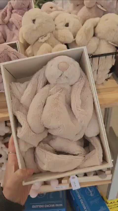 A luxurious newborn gift, the Bashful Luxe Bunny Willow Blankie is exquisitely soft in a willow hued fur. Featuring the head and paws of Willow Bunny in the corner of a silky soft blanket. Rolled and wrapped with a grosgrain ribbon and elegantly presented in a satin sheen gift box with a gold foil detail and matching gift card.