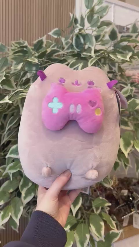 - PUSHEEN GAMER PLUSH: This adorable 9.5` plush features Pusheen in game mode, holding a colorful pink controller with multicolored buttons. She has a huggably soft body with purplish-gray plush, rosy cheeks, and purple stripes on her tail and back.