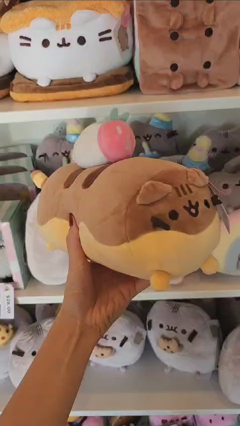 Oh, Pusheen is cute enough to eat! The latest Pusheen plush collection by GUND transforms the internet`s favorite lazy tabby cat into even more delicious treats, ranging from iconic beverages to decadent desserts and breakfast foods. This adorable Squisheen plush features Pusheen the Cat as an 11 long, yellow-and-brown chocolate-coated Eclair, topped with a pink plush strawberry and dollop of whipped cream. This Pusheen toy is made from a super-soft elastic material that makes her squishy and fun to squeeze perfect for anime fans, foodies, and plush collectors of every kind! Each Squisheen is designed with premium soft, surface-washable plush and ships in a protective poly bag. Appropriate for ages 8 and up. Pusheen is the sweet, lazy, plump tabby cat who loves to bring smiles and laughter to people worldwide in her popular webcomic, which is followed by over 10 million social media fans. Our collection of GUND Pusheen plush toys brings this lovable kitty and her adventures with Sloth, Stormy, Pip, Cheek, and more to your home, desk, or wherever you might want a smile. GUND Pusheen stuffed animals make adorable home decor and are the perfect gifts for cat lovers, Pusheen fans, and collectors of kawaii plush.