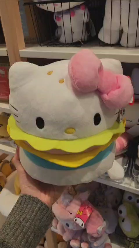 - HELLO KITTY HAMBURGER PLUSH: This soft 8` plush features Hello Kitty as a tasty hamburger! She has neon pink and blue patties with bright green and yellow felt toppings, sandwiched between two soft white buns embroidered with golden sesame seeds.
