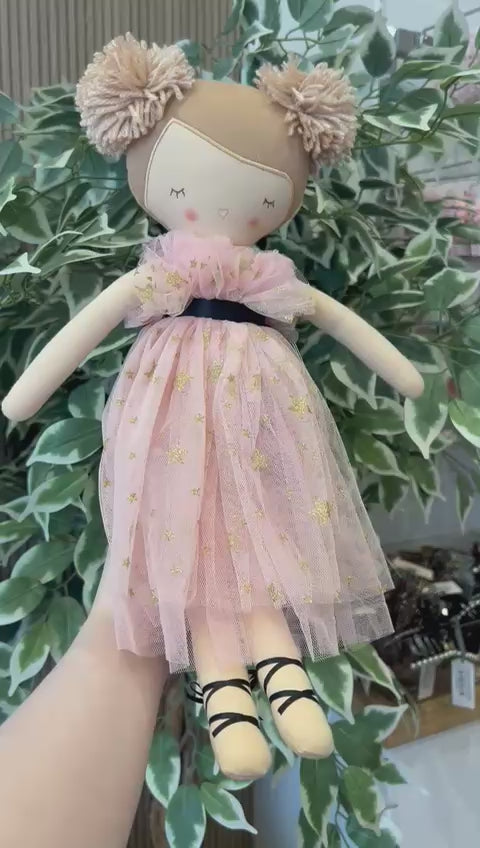 Elevate your child's playtime with the enchanting Alimrose Halle Ballerina Doll! Lovingly handcrafted by talented female artisans from The Philippines, this doll embodies craftsmanship and care in every stitch. Featuring a soft tulle layered ballet-style dress adorned with sparkly gold stars, delicate embroidered face details, and whimsical pom-pom yarn hair, the Halle Ballerina Doll is designed to ignite your child's imagination and bring joy to their play. With a diverse range of five combinations to choose from, there's a Halle Ballerina Doll for every child. Discover the magic of imaginative play with this exquisite doll today.
