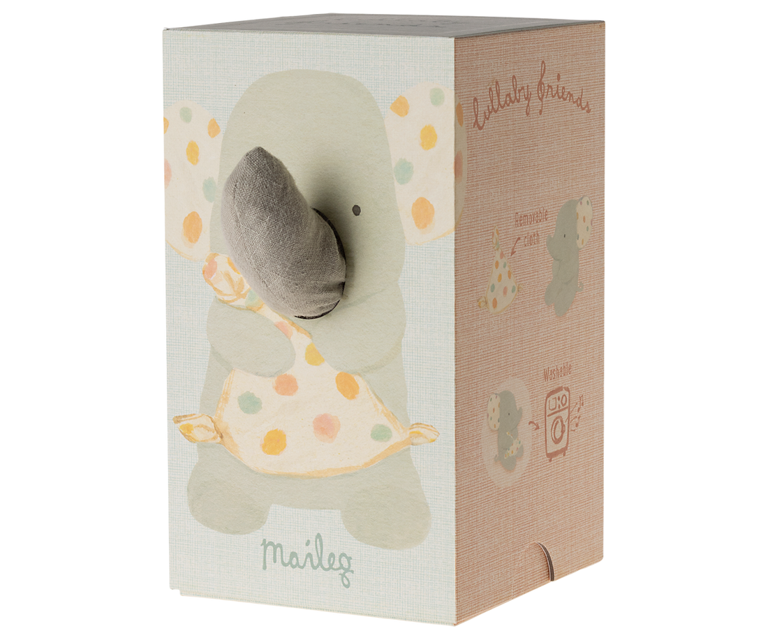 Lullaby friends is a collection of beautiful items for babies. This elephant has a soft cuddle cloth and will play Mozart´s lullaby when you pull the tail. It is made in soft fabrics with unique prints and packed in a beautiful gift box.